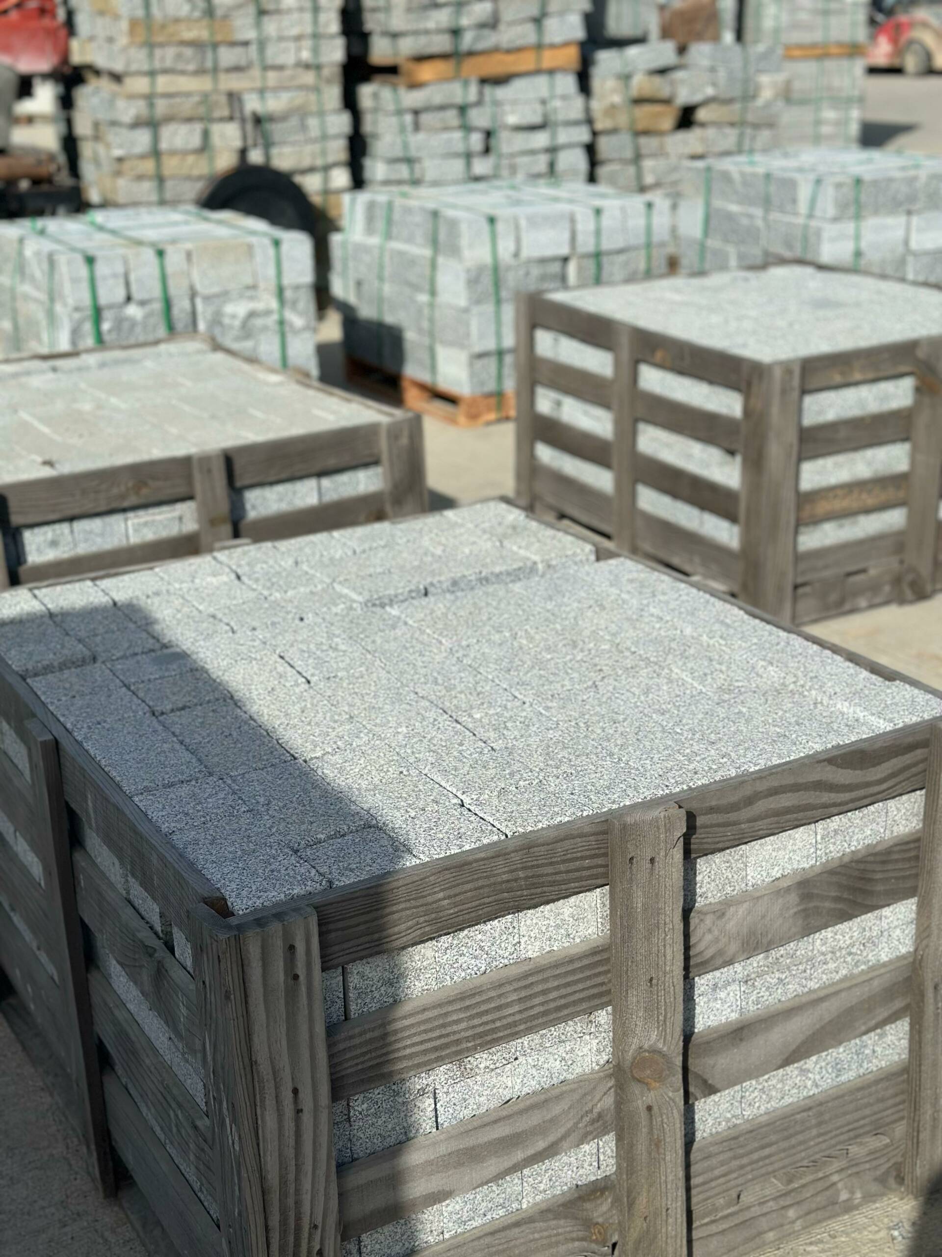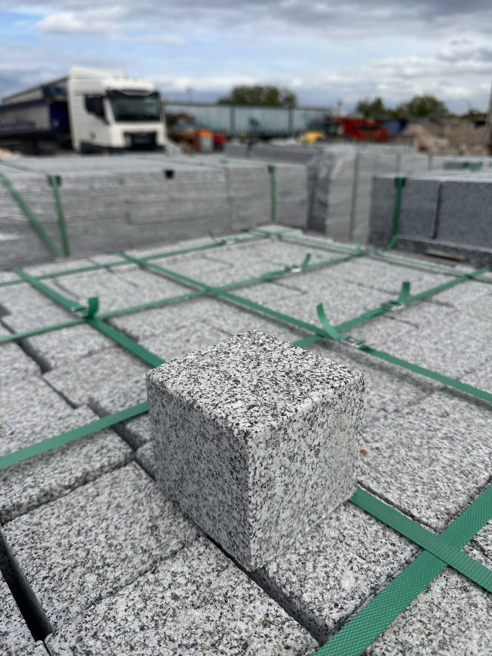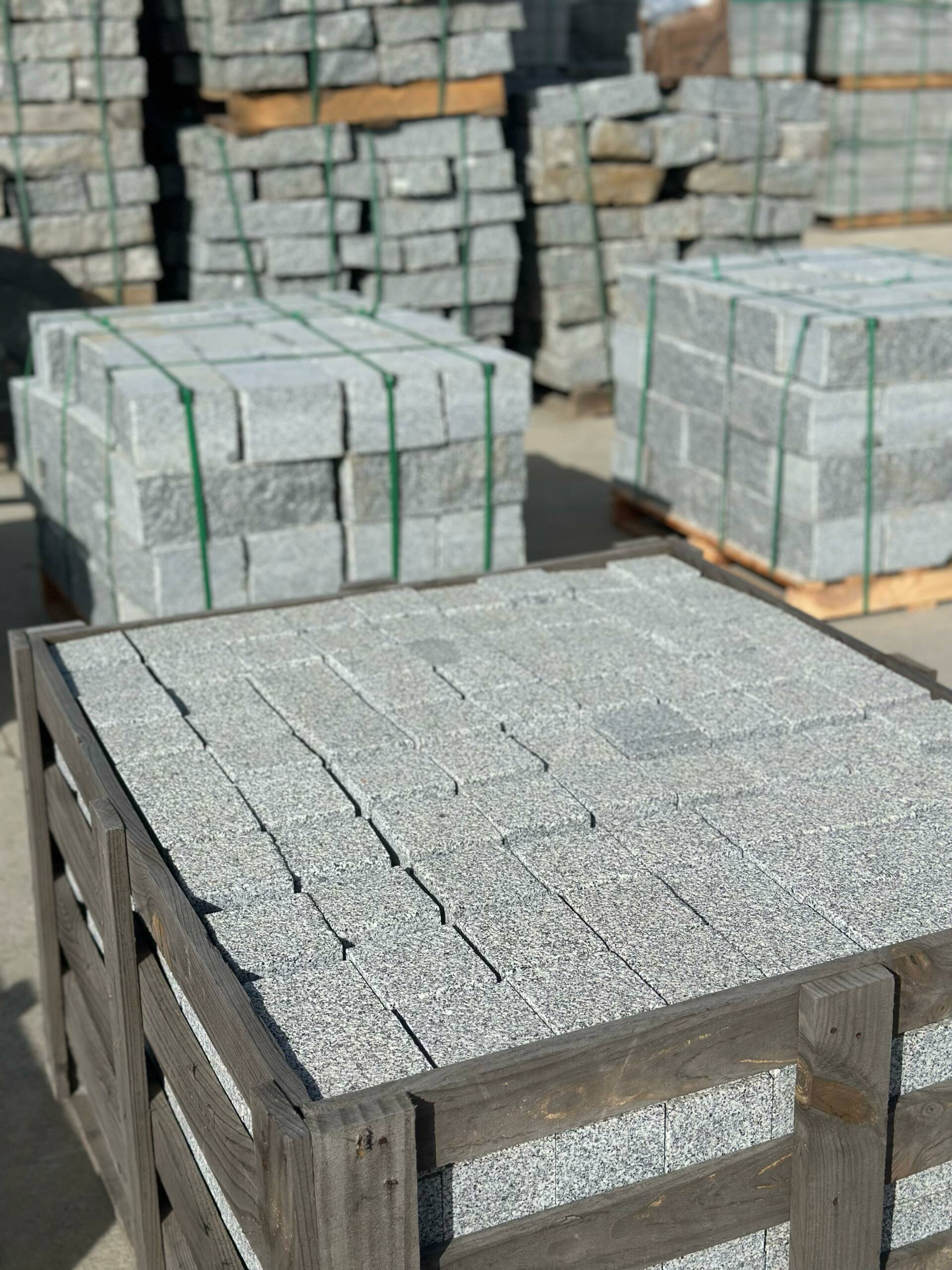 Granitpflaster 9 × 10 × 10 cm – Bergama Grau, gesägt & sandgestrahlt