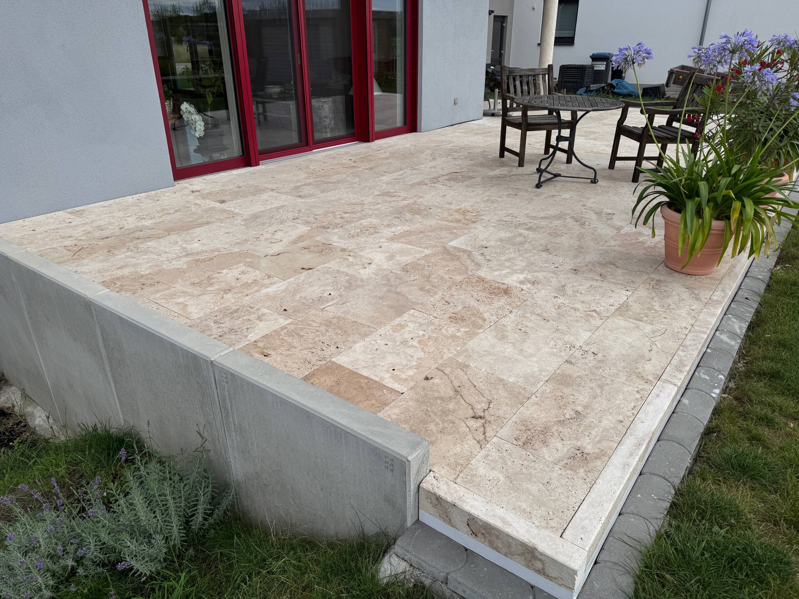 Unsere Travertin Classic Randsteine überzeugen durch ihre helle, mediterrane Natursteinoptik und eine hochwertige Verarbeitung. Die Oberfläche ist geschliffen und leicht gebürstet, die Kanten sind gefast – ideal für saubere, elegante Abschlüsse im Garten- und Landschaftsbau.