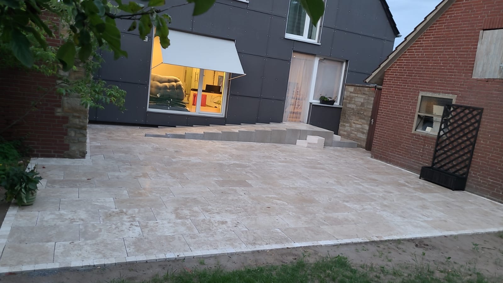 Travertin ist ein Kalkstein aus der Türkei mit charakteristischer, natürlicher Struktur und warmen Farbtönen. Der Stein ist frostbeständig und sowohl für Außenbereiche als auch für Nassbereiche geeignet.