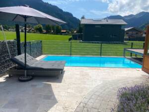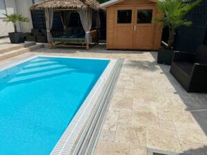 Travertin ist ein Kalkstein aus der Türkei und überzeugt durch seine natürliche, warme Optik. Die getrommelte Oberfläche sorgt für eine antike Optik mit weichen Kanten und mediterranem Charakter. Die Oberfläche ist rutschhemmend und optimal für den Poolbereich geeignet.